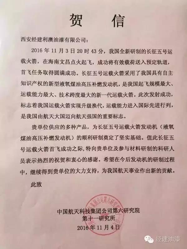 & nbsp;& nbsp;& nbsp; The success of the first flight of Long March 5 is an important symbol of China's progress from a space power to a space power. It is the best recognition of our company's strength that we can supply a variety of products for the Long March 5 and undertake the important task of supporting major national projects. The economic construction company sincerely expresses its joy and is proud of China Aerospace and economic construction paint.